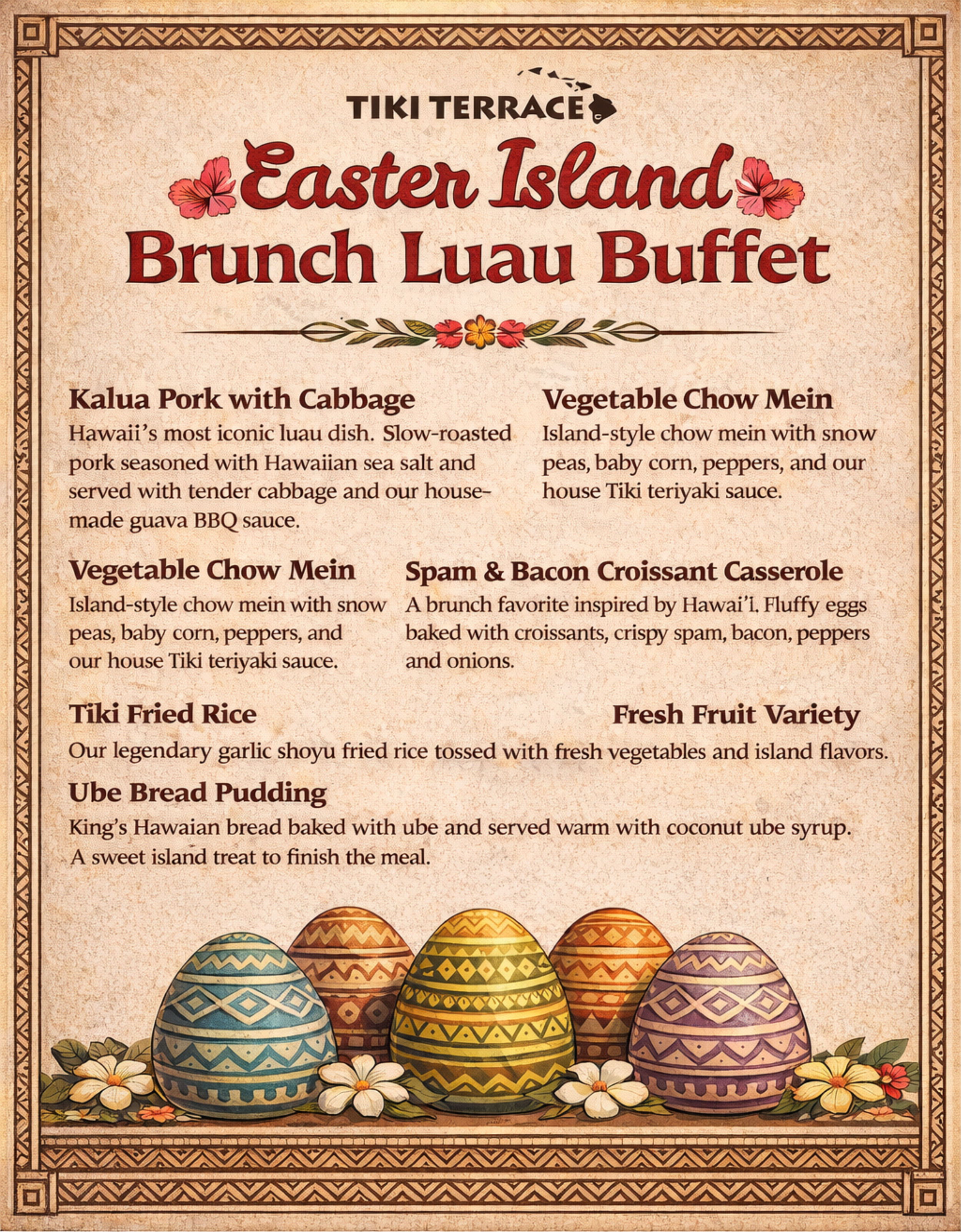 This Easter, treat your family to something truly special — our Annual Easter Island Brunch Luau at The Tiki Terrace! 🗿🌺